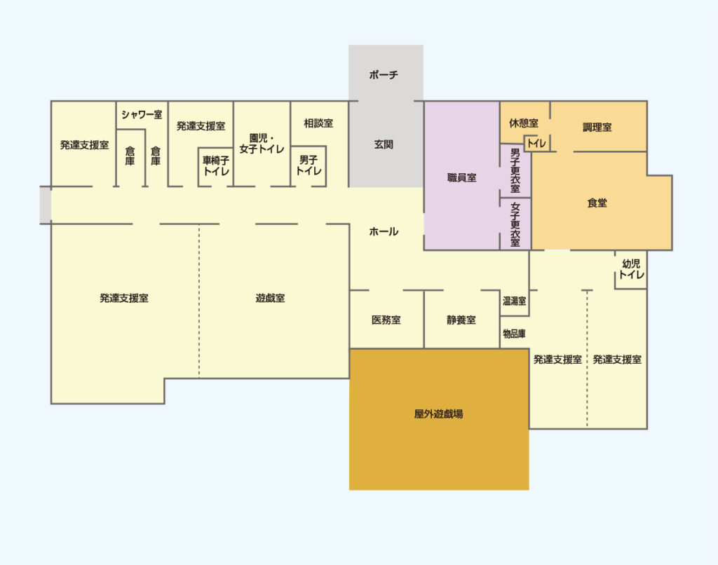 子どもたちへは、自分らしく地域で生活していける人に育つように、また保護者へは、子どもと共に地域で生活していく力を培えるように、保護者のニーズを取り入れながら機能訓練や生活指導、保育などを行っています。